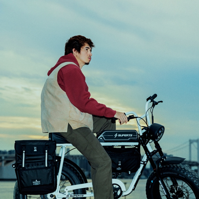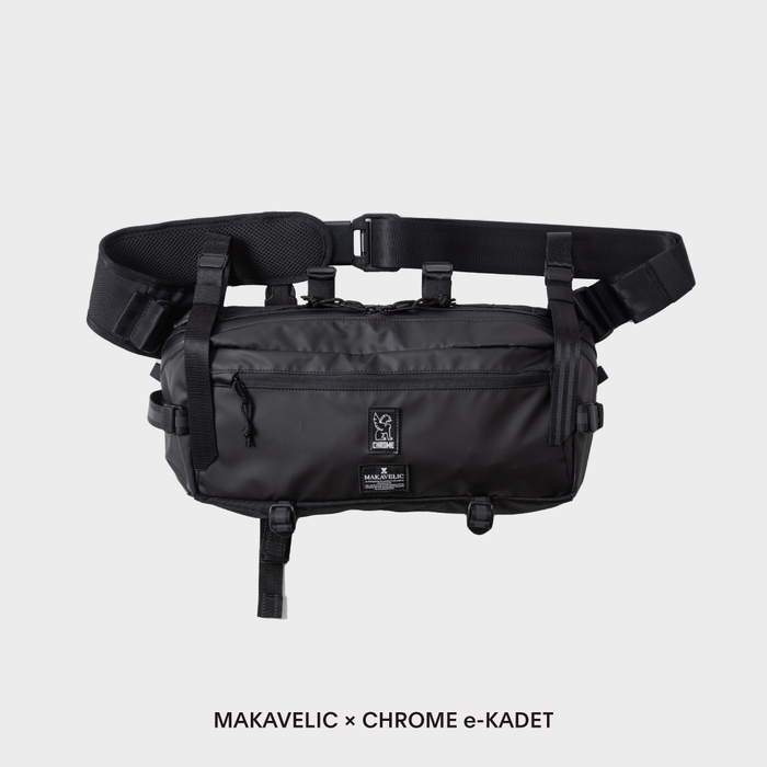 自転車生活を、より楽しく快適にするギアを生み出し続ける CHROMEと、SUPER73をはじめとするe-Bike専門店 MAD BOLT GARAGEを展開しているREGALITH社のオリジナルバッグブランド MAKAVELIC。バッグと自転車と言う共通項を持つライバル同士がお互いをリスペクトし、常にライバルとして切磋琢磨して高め合う中、今年10周年を迎えるMAKAVELICを祝福すべく協業し、より多くの人々に自転車を楽しんでもらえるようなバッグをとの想いからこのサプライズコラボが実現。今回はスペシャルコラボ仕様に仕上げた2スタイルを発表。最も人気の高いスリング”KADET”をベースにした『e-KADET』と驚きの5通りの使い方が可能な『HOLMAN PANNIER BAG』は、2023年10月27日(金)両ブランド公式オンラインストアやCHROME STOREなどの一部店舗にて限定販売開始。