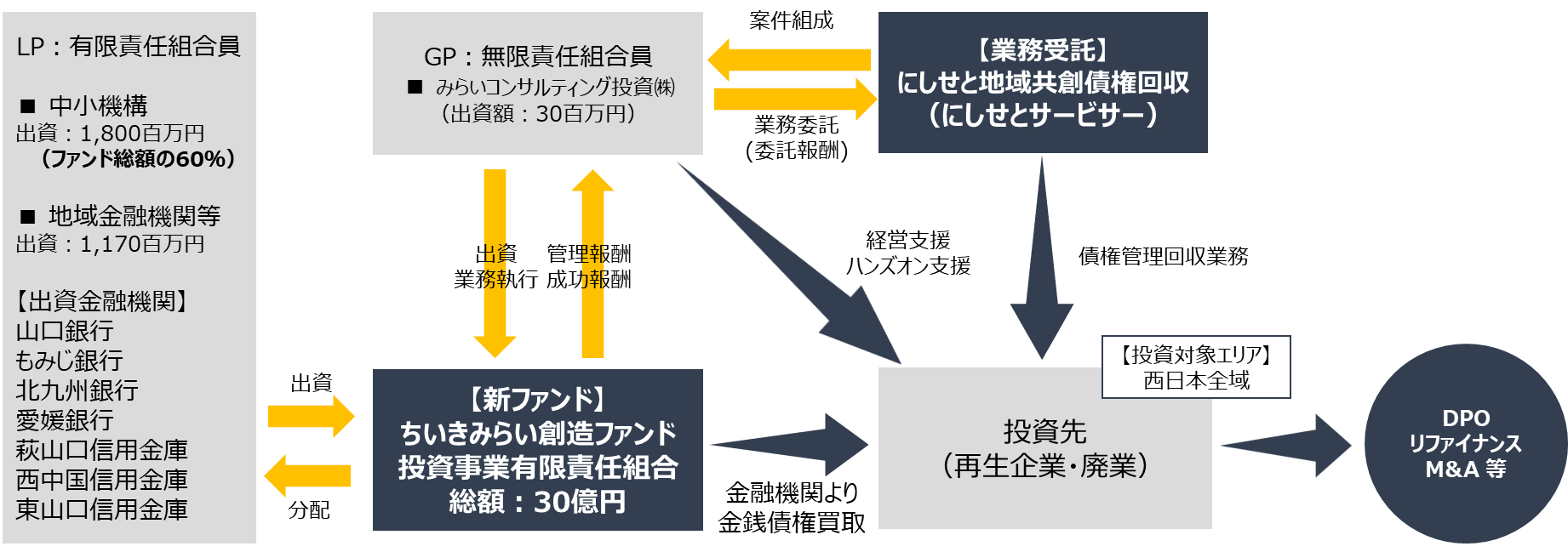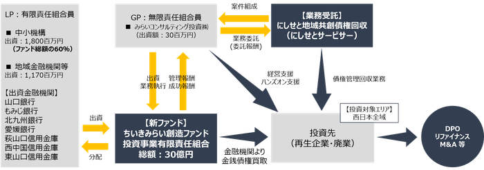 みらいコンサルティンググループ(本社:東京都中央区、代表:久保 光雄、岡田 烈司)は、グループ会社のみらいコンサルティング投資株式会社(代表取締役:木村 道泰)を通じて、山口フィナンシャルグループ(代表取締役社長CEO:椋梨 敬介)の子会社である、にしせと地域共創債権回収(代表取締役:坂本 直樹)、および中小企業基盤整備機構(以下、中小機構)を筆頭とする出資者と協働し、中小企業再生ファンド「ちいきみらい創造ファンド投資事業有限責任組合」を設立いたしました。