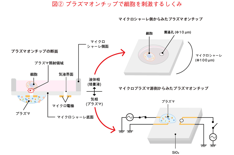 それを解決したのが、「プラズマオンチップ」というアイデアです。これは1辺が100μm(ミクロン:1μmは1000分の1mm)、深さが200μmのマイクロシャーレに、細胞が入った液体培地を入れ、底部に空けられた直径10μmの貫通孔からプラズマを照射するという方法(図(2))。夏にそうめんの水をざるで切った時、ざるの目についた水がなかなか落ちないことがありますよね。これは水の表面張力のせいですが、それと同じでマイクロシャーレの10μmの貫通孔から液体培地が漏れることはありませんし、細胞の大きさは20~30μmですから、孔から落ちることもありません。このマイクロシャーレの下でプラズマを発生させることにより、液体培地の界面から内側の細胞にダイレクトにプラズマを照射することが可能になりました。実はこの方法、私がかつてMEMSの開発で得たシリコンウェハに微細加工するノウハウをそのまま生かしたもの。私たちはこの方法を「プラズマオンチップ」と名付けました。そしてこの「プラズマオンチップ法」を発表したところ、2018年に第40回応用物理学会優秀論文賞を受賞することができました。