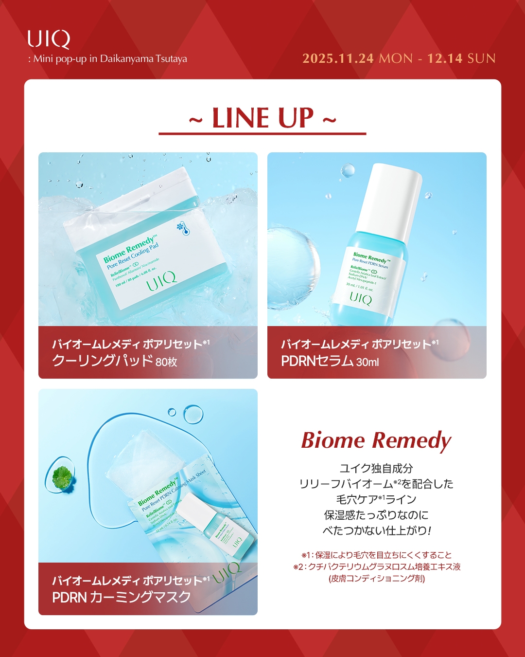 韓国No.1のマイクロバイオーム専門企業「Genome & Company(ジノムアンドカンパニー)」の独自技術から誕生したスキンケアブランド「UIQ(ユイク)」が、今年夏に代官山 蔦屋書店で開催し大盛況だった「RIIZE × UIQポップアップストア」への多くのリクエストにお応えし、再びミニポップアップを設置いたします。