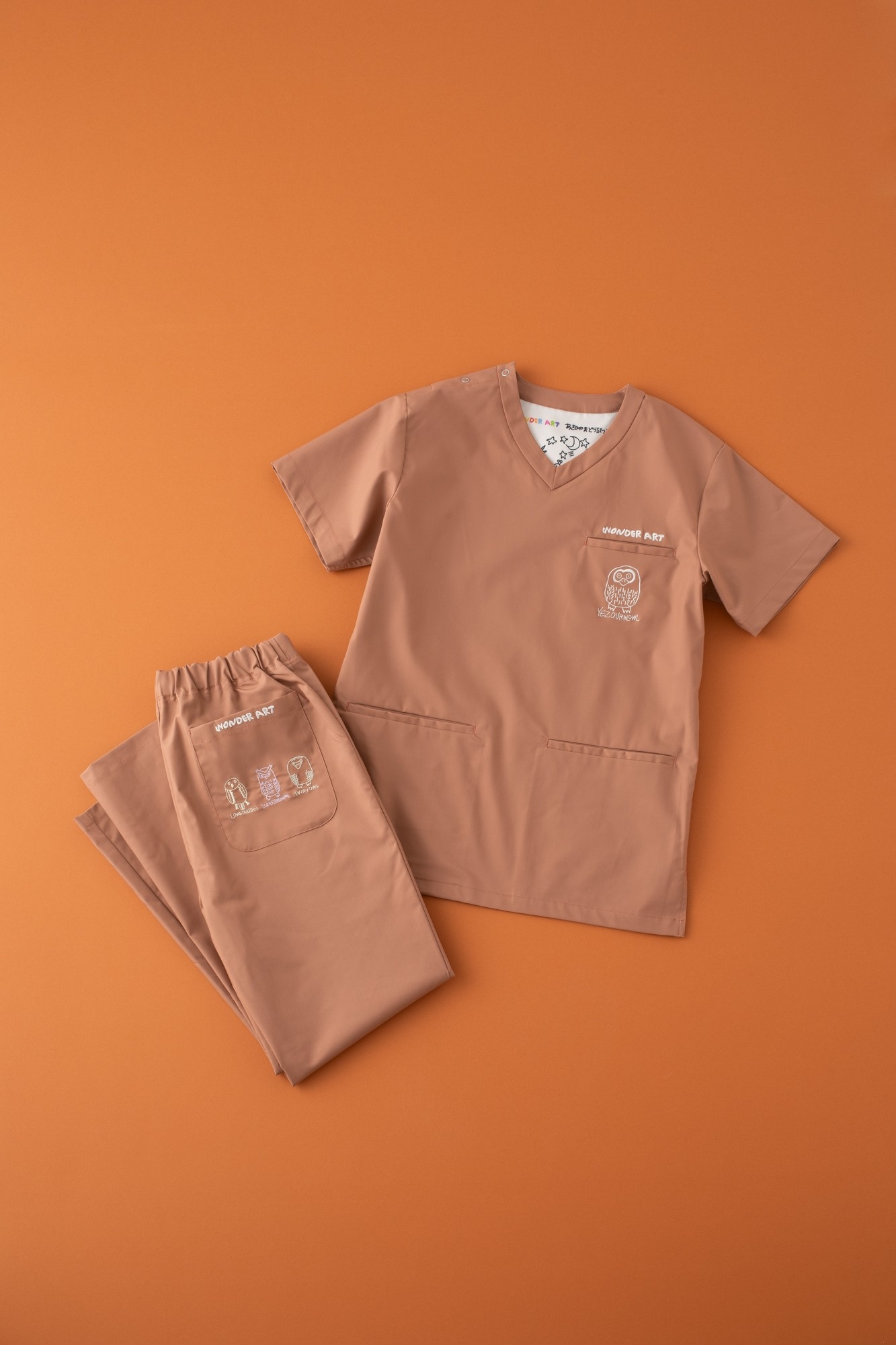 スクラブでは、それぞれの特徴を丁寧に捉えた1羽1羽の個性を、微配色パステルカラーの刺繍で表現。ベースには土をイメージしたやさしいオレンジを採用し、動物たちが自然の中で穏やかに佇む風景を感じられるよう仕上げました。