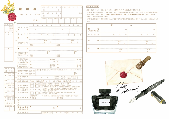 婚姻届を通じて、お客様の特別な結婚の日を永遠に記憶に残る形で演出し、家族の絆を深める役割を果たします。湯浅 望さんのイラストは、現代的な美しさと伝統的な要素が調和した美しいデザイン。