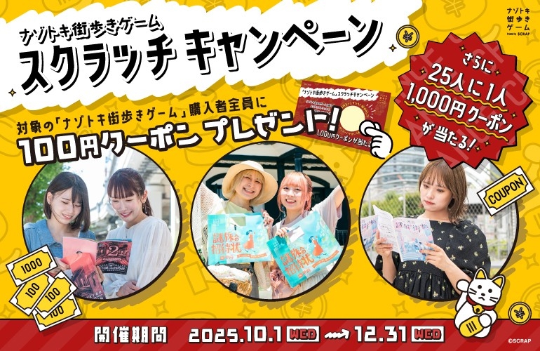 現在SCRAPでは、2025年10月1日(水)〜12月31日(水)の期間中、「ナゾトキ街歩きゲーム スクラッチキャンペーン」も開催中。対象の「ナゾトキ街歩きゲーム」を遊んだ人全員に、100円分の割引クーポンがついたスクラッチカードをプレゼントいたします。さらに、スクラッチ部分をこすると1,000円分の割引クーポンが当たるお得なキャンペーンです。