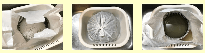 二重にしたビニル袋の中に、50℃程度のお湯を入れてオキシクリーンを溶かします。そこに換気扇を漬けおくだけです。汚れの落ち具合を見ながら、30分程度、漬けおいたらお湯ですすいで完了。フチに残った汚れは、使い古しの歯ブラシを使って落とすとよいでしょう。