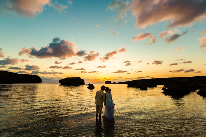 世界屈指の透明度を誇る美しい海で有名な宮古島。「宮古ブルー」と言われる、エメラルドグリーンやコバルトブルーの海と、雪のように白い砂浜で、ここでしか撮れないフォトジェニックな結婚写真が残せます。