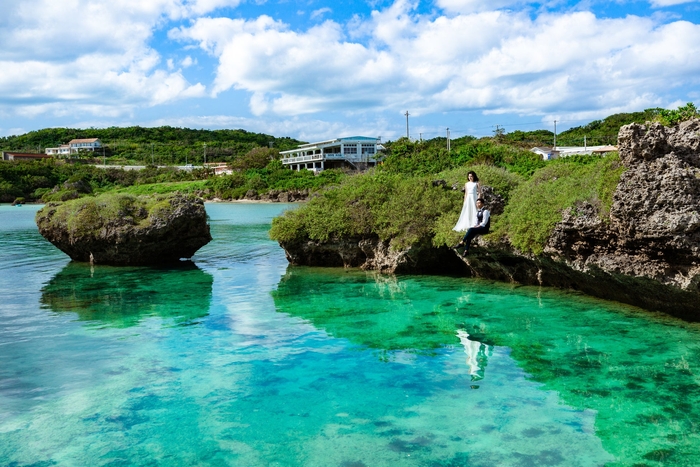 宮古島南部にある天然の入り江「イムギャーマリンガーデン」は、隠れた人気スポットです。穏やかなビーチはまるで青い池のよう。入り江を囲む岩山での撮影もおすすめです。