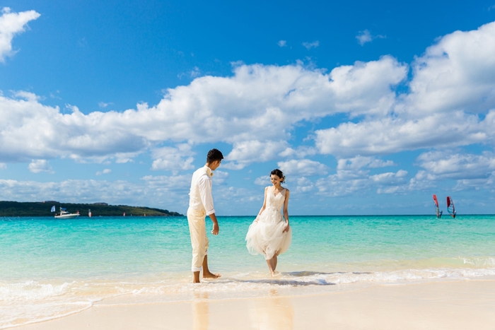 「宮古ブルー」と言われる、エメラルドグリーンやコバルトブルーの海と、雪のように白い砂浜で、ここでしか撮れない結婚写真が残せます。