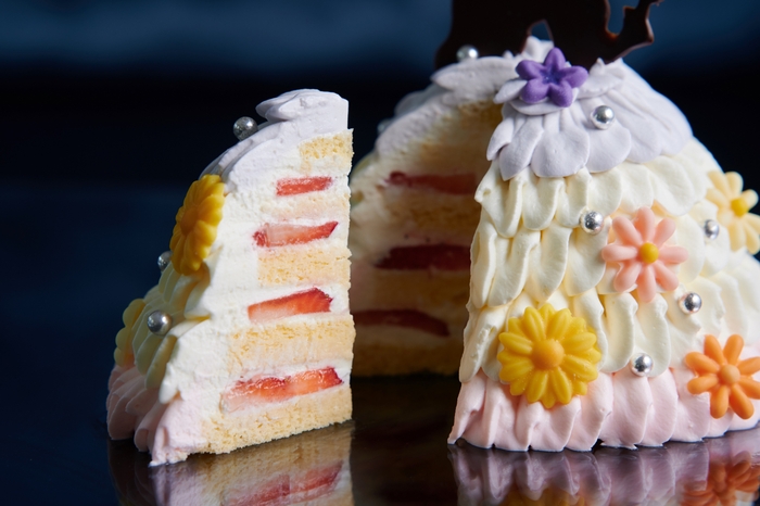 カラフルなお花が散りばめられたグラデーションカラーが美しいドレスの中は、苺のショートケーキ。滑らかで口当たりが良い甘さ控えめの生クリームと、甘酸っぱい苺との相性は抜群です。