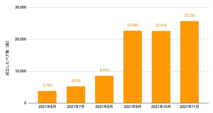 2021年6月にイベントで出会ったユーザー間で友だちとしてつながれる機能をリリースし、5ヶ月間で成立したペア数は680%に成長して累計88,637組、11月には月間25,735組が成立しました。