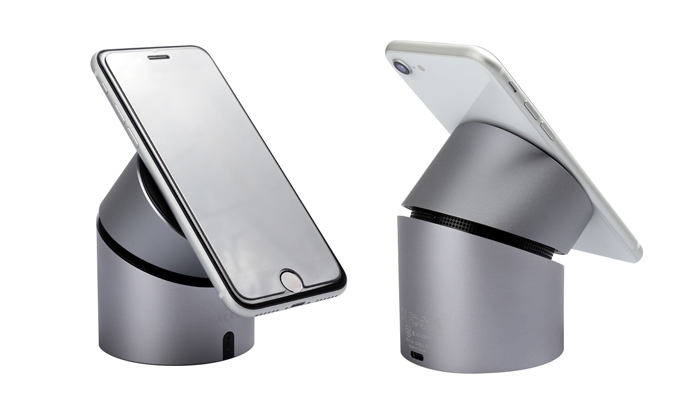 本製品は.360°全面に広がるBluetoothスピーカーを内蔵したワイヤレス充電スタンドです。充電パッド部にはスマートフォンが滑り落ちないようシリコンマット素材を採用。本体上部の回転機構で最適な角度に調整ができ、スマートフォンスタンドとしても使用可能です。