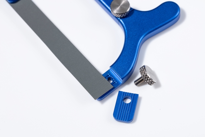 紙ヤスリ・布ヤスリを帯状にしっかりと張って取り付けることができる隙間磨き用ハンドツール。ヤスリを取りつけ後に中央のネジでゆるみを調整し、ワークへのあたりを適切に変化させられます。