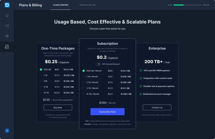 「サブスクリプション」プランは、1カ月あたりの処理容量上限(例:2TB/月)をご選択いただくシンプルなプランです。2024年2月のサービス開始時から提供しておりますが、今回新たに、お得な年間プランをご用意いたしました。日々追加されていくビデオファイルを軽量化し続けていきたいというお客様に最適です。