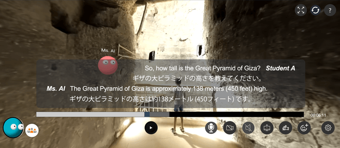 また、ワールド内ではあなたとAIの会話が英文で表示されるだけでなく、自動翻訳されたあなたの母国語(日本語)も同時にバイリンガルで字幕表示できます。