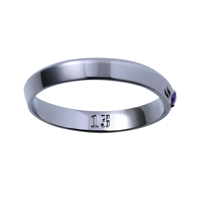 エヴァ第13号機の頭部からデザインを取り込み、中央には機体メインカラーのストーンをセット。機体をイメージしたブラックコーティングで仕上げました。内側には機体番号を刻印。