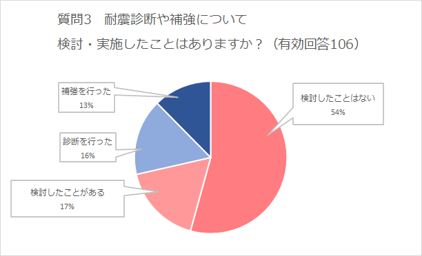 本セミナーには防災に意識が向いている方が参加されていると思われますが、その中でも「耐震診断を行った人」は16%、「耐震補強工事を実施した人」は13%となり、合計すると約3割の人が耐震診断か補強工事を実施していました。