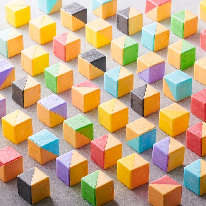 口当たりの軽いチョコレートをキューブ型の最中皮に詰めた和風ボンボンチョコ。カラフルな色味のサクッと香ばしい最中に、それぞれの色味にあったフレーバーのチョコレートを合わせた亀屋万年堂ならではのチョコレートです。黒・赤・黄色・紫・緑・水色の織りなす豊かな色合いはギフトで喜ばれること間違いなし!です。