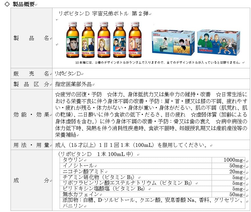 大正製薬株式会社[本社:東京都豊島区 社長:上原 茂](以下、当社)は、人気漫画「宇宙兄弟」のキャラクターをデザインした “リポビタンD 宇宙兄弟ボトル 第2弾”を当社オンラインショップ「大正製薬ダイレクト」にて、9月1日(水)より数量限定にて発売いたします。