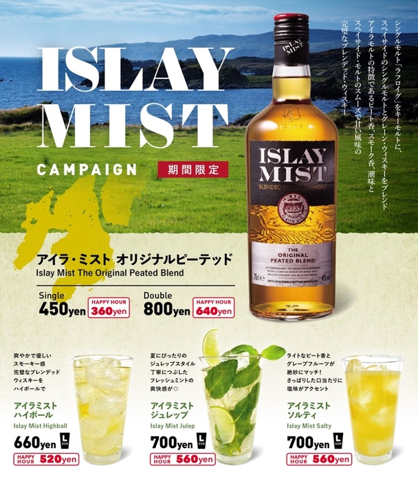 アイラ・ミスト オリジナルピーテッドの潮の香りを感じるすっきりとしたハイボールとカクテルを販売いたします。ご購入につきダイスチャレンジでラフロイグスプレーをした生チョコをプレゼントいたします。