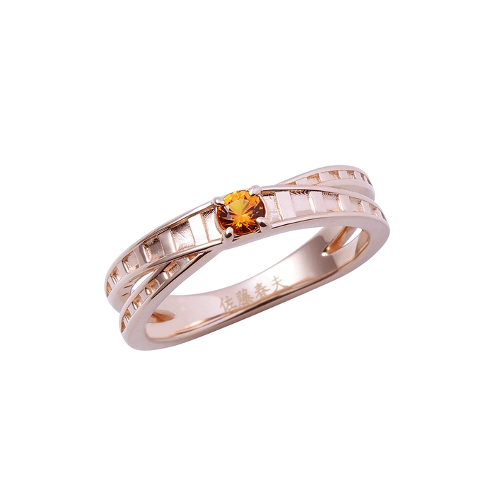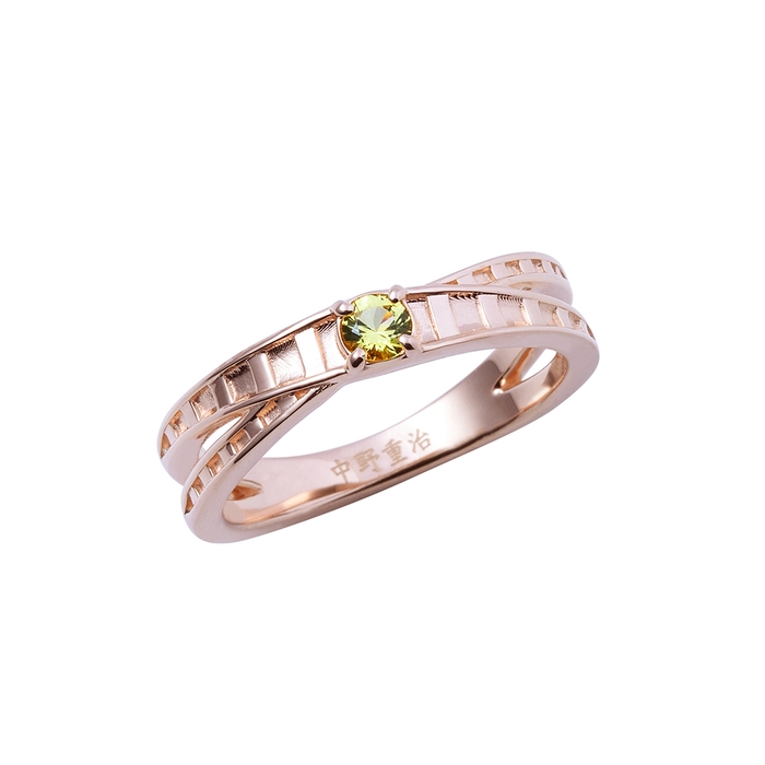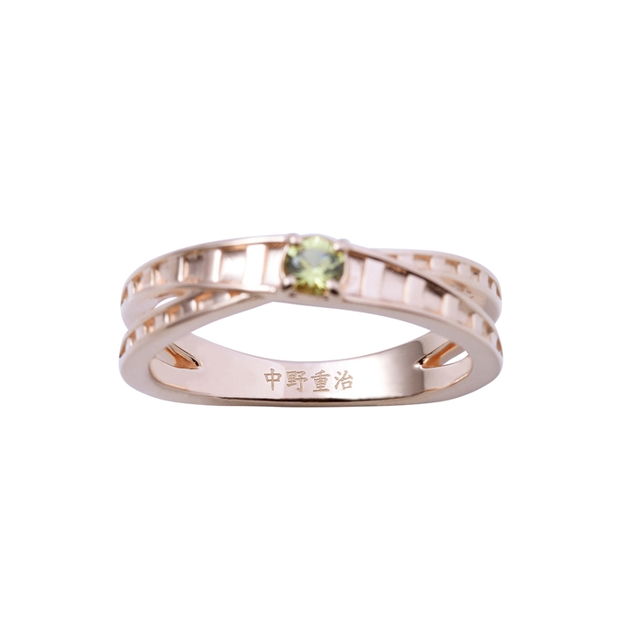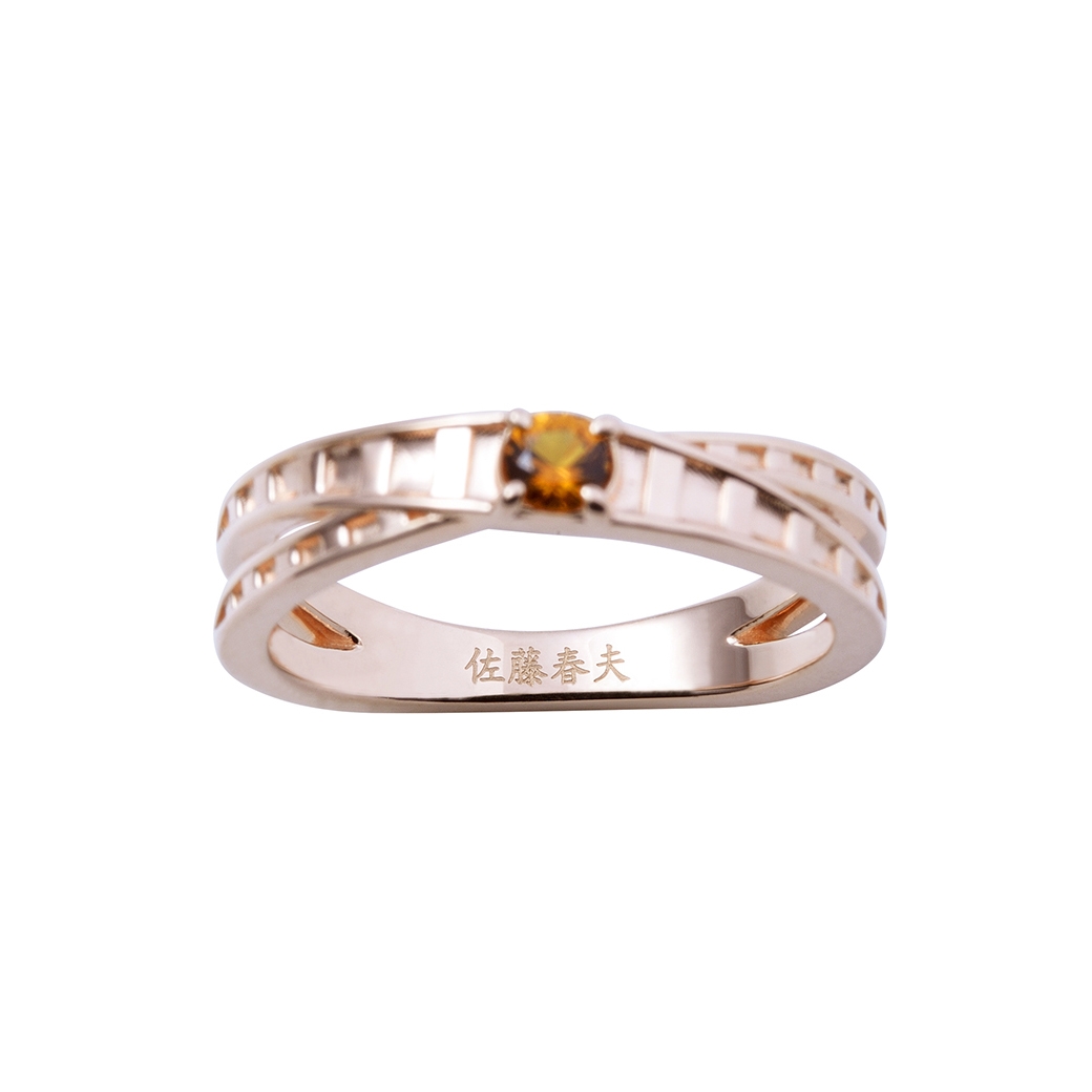 ピンクゴールドコーティングを施した表面にはイメージカラーストーン、内側には名前を刻印しました。