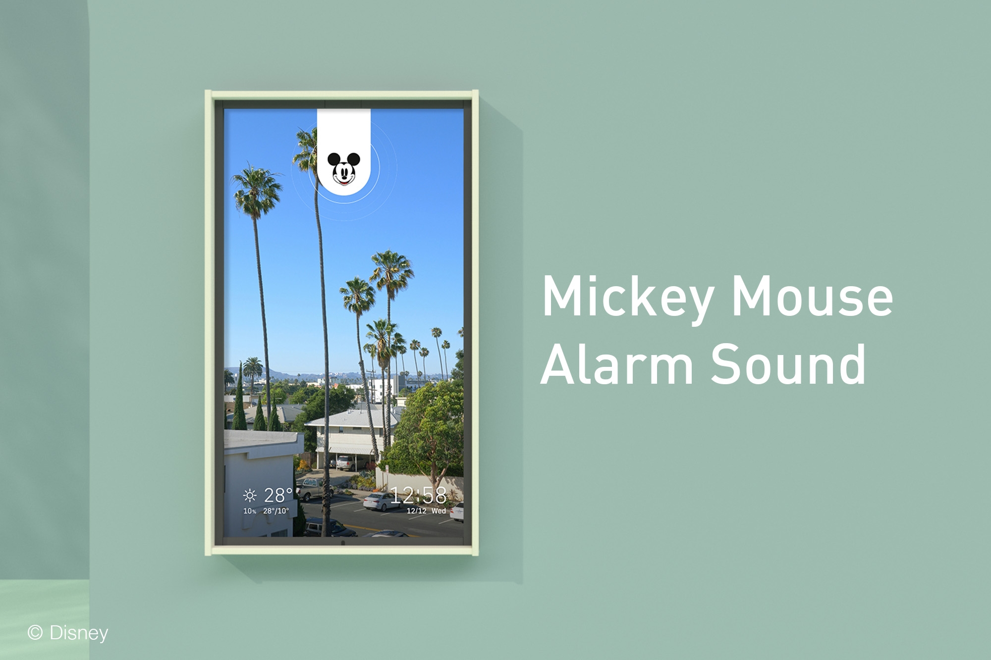 Atmoph Window 2のデイリールーティーン機能では、好きな時間にアラーム音と共に電源ON/OFF、窓の照度やカレンダー、天気などの表示ON/OFFを設定できます。今回のDisneyモデルでは、アラーム音にミッキーマウスのボイス音を搭載。さらに、ミッキーマウスのボイスと共にミッキーマウスのアイコンも登場します。