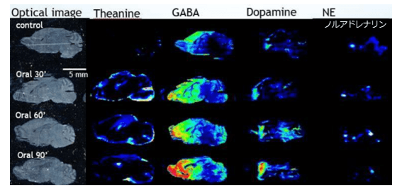GABA、ドパミンは抑制系、快楽系物質、ノルアドレナリンは興奮系物質であることから、テアニン投与により脳内では興奮系よりも抑制系・快楽系物質が増加することが視覚的に示されました。今後、さらに詳細に解析することで、テアニンの脳機能調節作用のメカニズムが明らかになることが期待されます。