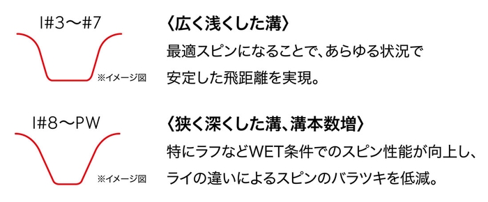 最適なスピンを生み出し、状況に応じたパフォーマンスを発揮する「番手別溝設計」であらゆる状況でも安定した飛距離を実現します。