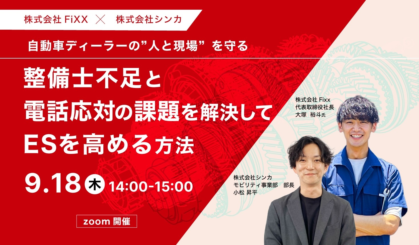 コミュニケーションプラットフォーム「カイクラ」の開発・販売を行う株式会社シンカ(本社:東京都千代田区、代表取締役社⻑CEO 江尻 高宏、以下「シンカ」)は、全国1,100拠点以上のサポート実績を持つ出張整備サービスを提供する株式会社Fixx(本社:東京都新宿区、代表 大塚 裕斗、以下「Fixx」)と、自動車ディーラーが直面する整備士不足や電話応対負担の課題に対し、現場の負担軽減と従業員満足度(ES)向上を実現する実践的な解決策を提供する共催セミナー「自動車ディーラーの“人と現場”を守る──整備士不足と電話応対の課題を解決してESを高める方法」を開催いたします。