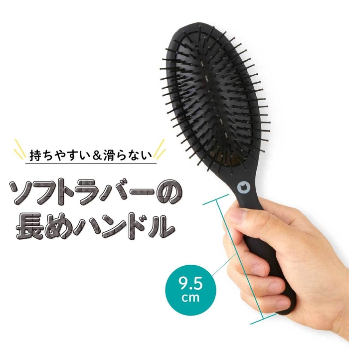 ブラシのハンドル部分は、大切なブラッシング中に手が滑ってしまうことがないようにソフトラバー仕様に。長めの柄なので、持ちやすく、動かしやすい形状です。ブラシ中央には猫のフェイスマーク、ブラシ裏側には肉球足跡模様をプラスし、ブラッシングタイムを楽しく演出します。