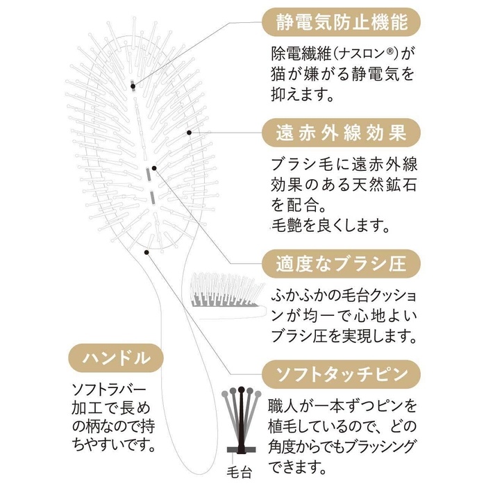 ブラシ毛台は、優しい弾力のソフトクッションタイプ。均一で心地よいブラシ圧を実現しました。ブラシピンは職人技で1本ずつ丁寧に植毛されているので、どの角度でもブラッシングが可能。ブラシが体に押し付けられたり、毛が引っ張られたりすることなく、猫の体全身を猫壱の猫用ブラシ1本で、猫も人も心地よくブラッシングできます。