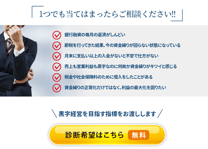 また、黒字経営を目指す指標をお渡しする無料診断も受け付けておりますので、