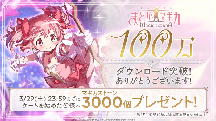 新作アプリゲーム『魔法少女まどか☆マギカ Magia Exedra』 100万ダウンロード突破!3月29日(土)23:59までにゲームを開始するとマギカストーン3,000個プレゼント!