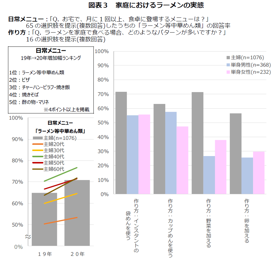 日常メニューの増加幅1位は「ラーメン等中華めん類」。主婦全体では19年→20年で6ポイント増。主婦40代で77%と最も高く、主婦60代で8ポイント増と最も増加。