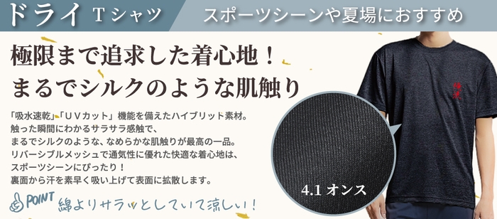 ドライTシャツは、最適な快適さを生む「4.1オンス」という厚み、多機能でありながらコスパ抜群ライト価格、豊富なカラー・サイズ展開を兼ね備えたアクティブシーンに欠かせないドライTシャツ。インナーとしての活用のみならず、スポーツチームやグループでおそろいTシャツとしてオリジナルのデザインを施すのに最適です。