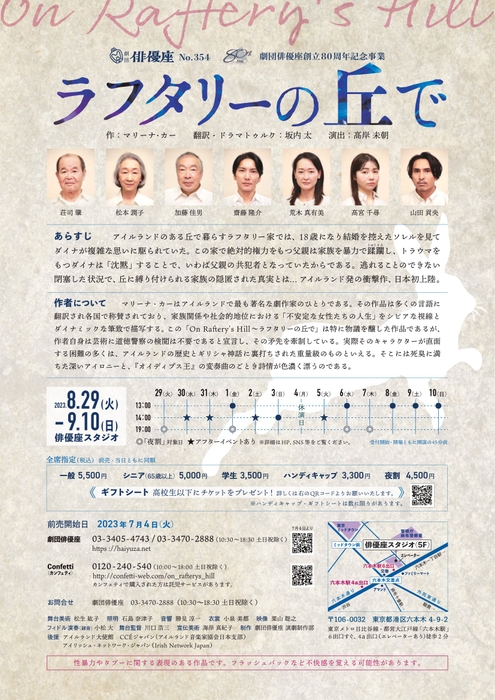 劇団俳優座主催、劇団俳優座No.354『ラフタリーの丘で』が2023年8月29日 (火) ~2023年9月10日 (日)に俳優座スタジオ(東京都港区六本木4-9-25F)にて上演されます。