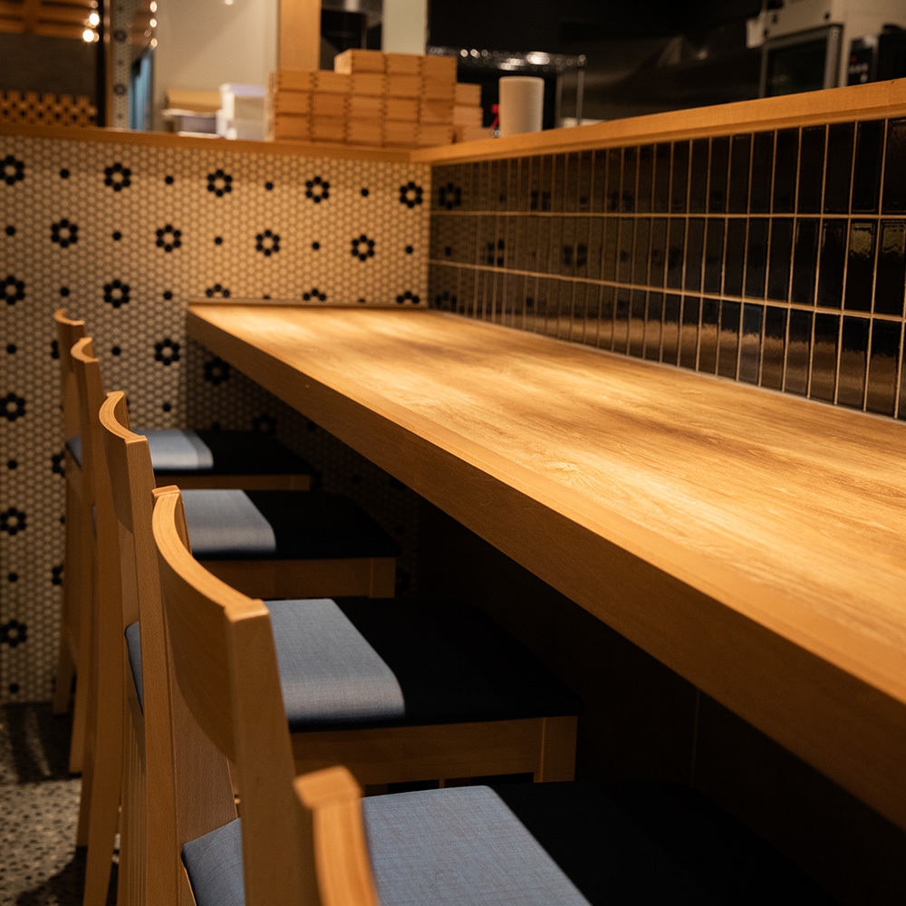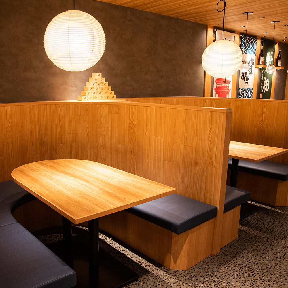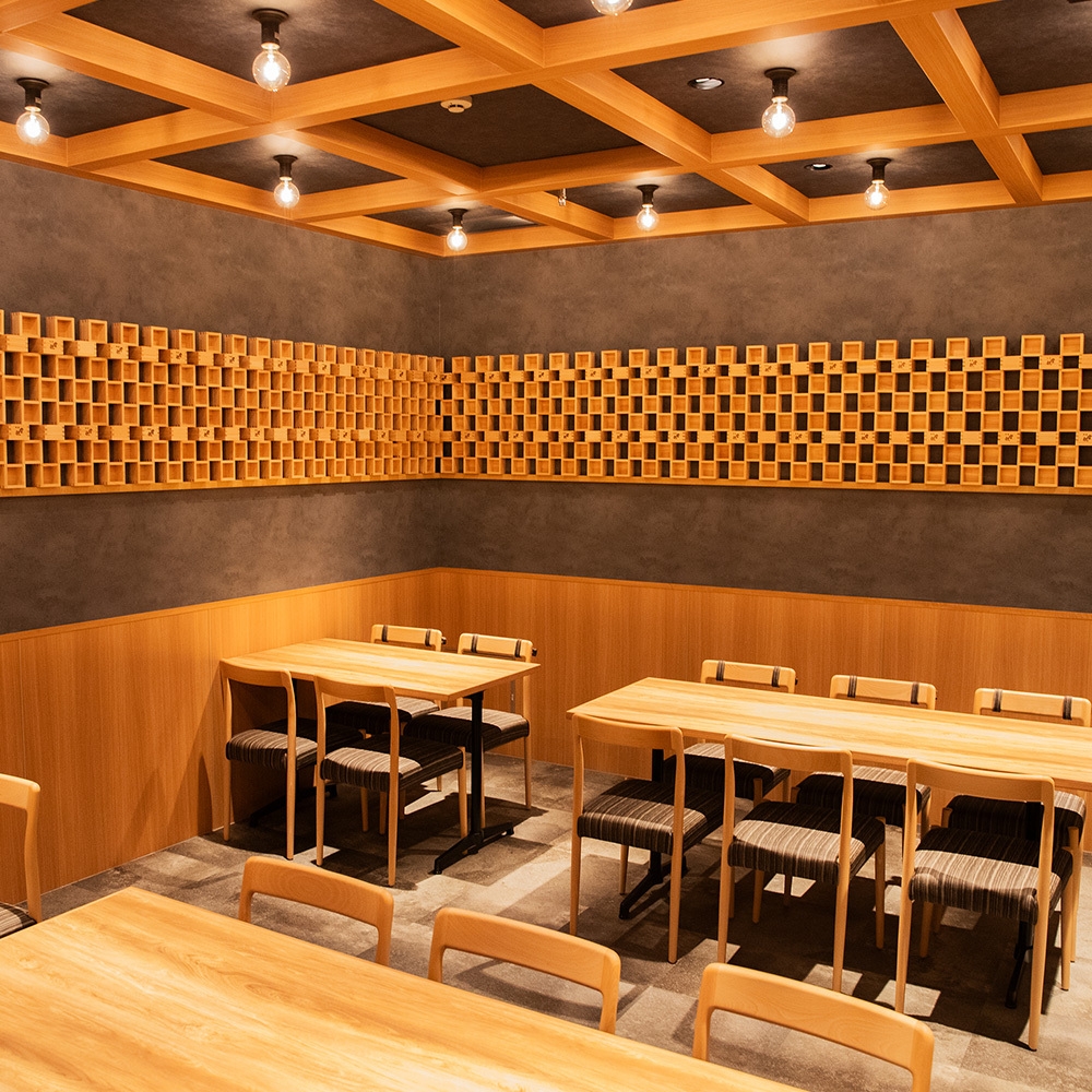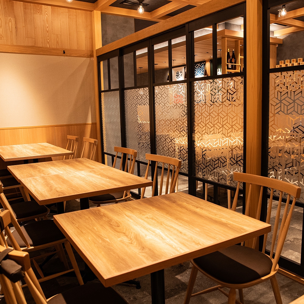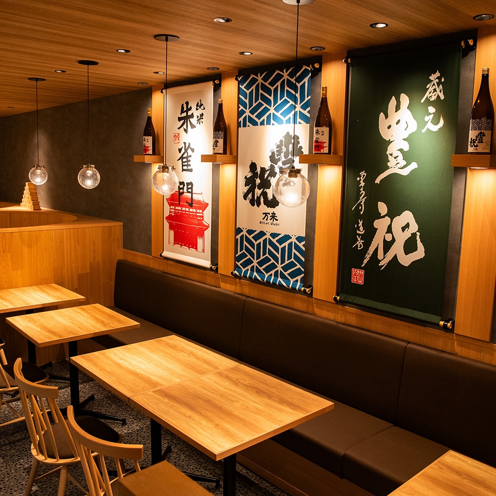 木と紺色を基調とした明るい店内には、枡を使った装飾や和紙の照明、日本酒のラベルをモチーフにしたのれんなどを飾り、女子会やデート使いにもおすすめです。