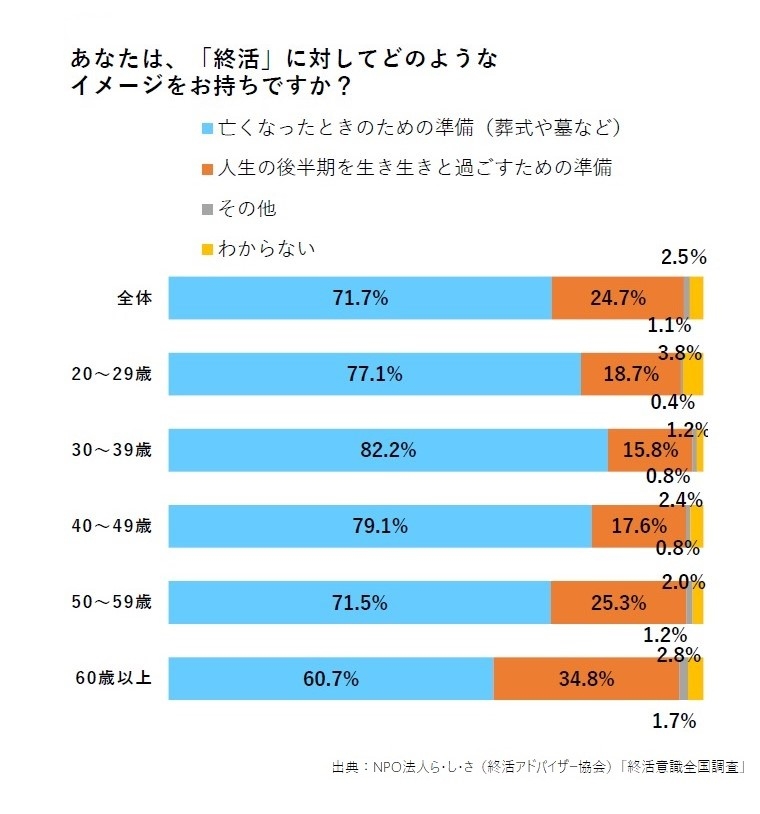 実際、年齢が上がるにつれ、終活をより前向きなものとして捉える方が多くなっているという調査結果もあり、人生の終わりを自身の身に迫りつつあることとして実感する段階において、終活が将来の不安を軽減する一役を担っている可能性も示唆されます。