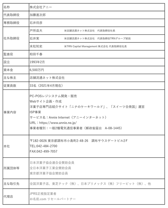 店舗流通ネット株式会社(東京都港区:代表取締役社長 戸所岳大)は、製菓・製パン店専用顧客管理POSシステムを提供する株式会社アニー(東京都調布市:代表取締役 加藤進次郎)の全株式を取得し、2021年3月1日に完全子会社化いたしました。これに伴い、役員人事についても下記に就任いたしました。