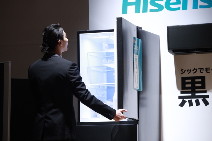 続いて、ハイセンスジャパン株式会社 副社長の山本 一人氏より、白物家電分野に注力する背景と新製品の詳細が紹介されました。プレゼンテーションでは、冷蔵庫やエアコンなど日常生活に欠かせない家電製品の機能性とデザイン性を両立させた魅力が語られました。テレビ事業で大きく躍進した背景を受け「日本の白物家電市場においても、大きな発展を遂げたい」と語り、利便性の高い冷蔵庫の新機能「ぴたよせドア」について紹介しました。
