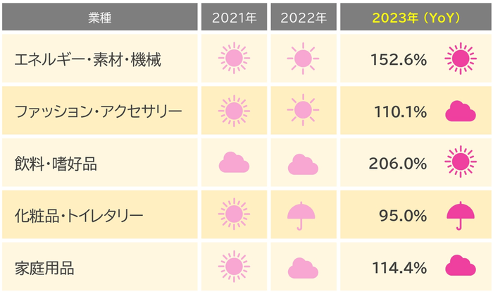 前年と比較して大きく数値を伸ばした業種が多く、飲料・嗜好品は200%を超えた。