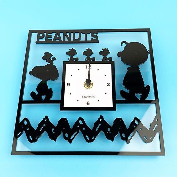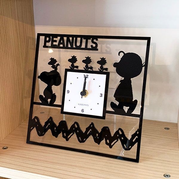 シルエットのキャラクターがクールな掛け時計もおしゃれ♡ロゴとチャーリー・ブラウンの服の柄も入ってスヌーピーアイテムのかわいさが詰まってます。