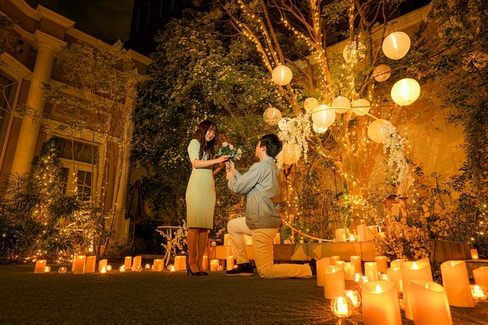 2021年7月1日(木)からは、お好みに合わせて荘厳なステンドグラスのチャペル、もしくはキャンドルが煌めくプライベートガーデンから大切なプロポーズのロケーションをお選びいただける新プランが登場。普段はなかなかお入りいただくことの少ない憧れのチャペルや都心の喧騒を忘れさせてくれるプライベートガーデンをお二人だけで貸し切り、一生の記念に残るロマンチックなプロポーズを叶えていただけます。
