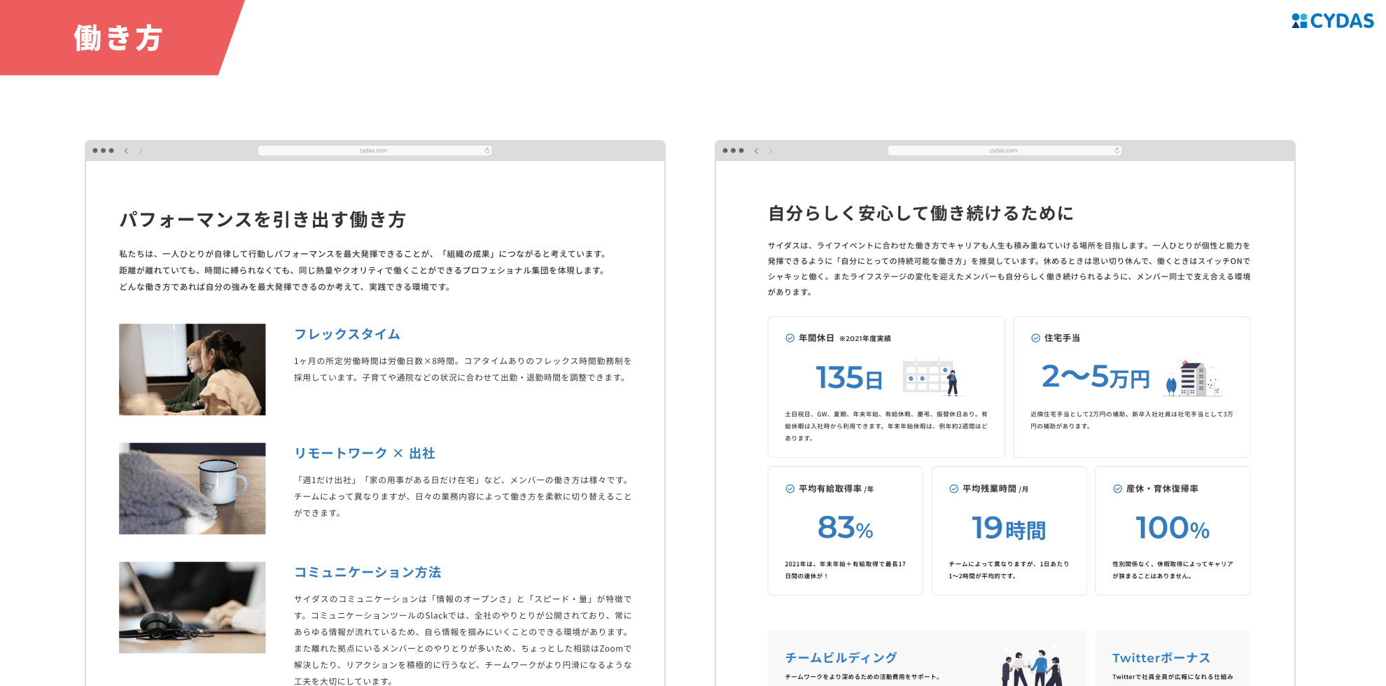働き方ページでは、各種制度の紹介はもちろん、社内ツールの紹介や社員の1日の過ごし方記事など、多彩なコンテンツを用意しています。