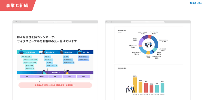 「働きがい」をつくる人事DX「CYDAS PEOPLE」を提供するサイダスは、タレントマネジメントシステム業界のパイオニアとして、様々な人事課題・組織課題と向き合ってきました。社員数が100名を超え拡大フェーズにある今、各職種において採用を強化すべく本リニューアルを実施。より社風や働く環境、人々の魅力が伝わるサイトへと生まれ変わりました。