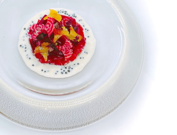 ビーツとフランボワーズのアクセント エルダーフラワー香るオマール海老の旨味