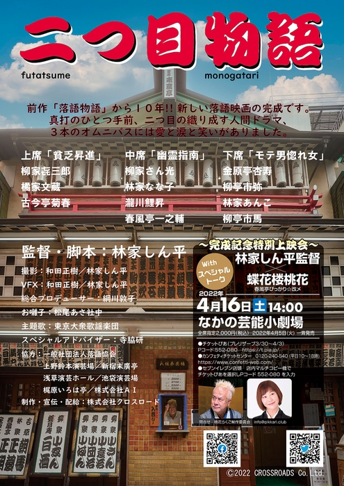 桃花らくご制作委員会『「二つ目物語」完成記念特別上映会』が2022年4月16日 (土)になかの芸能小劇場(東京都中野区)にて開催されます。チケットはカンフェティ(運営:ロングランプランニング株式会社、東京都新宿区、代表取締役:榑松 大剛)にてイベント当日まで発売中です。