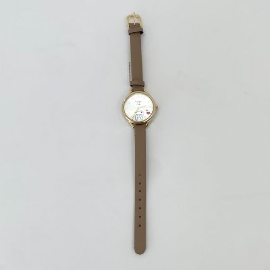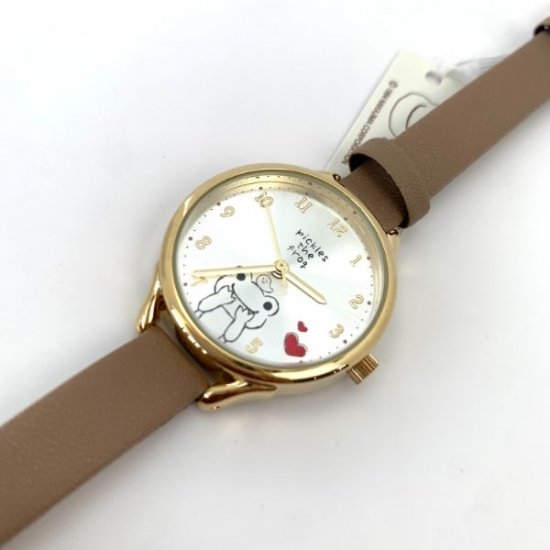 まずは人気のかえるのピクルスから。レザー風のブラウンベージュのベルトとゴールドカラーのフチがシンプルな腕時計です。