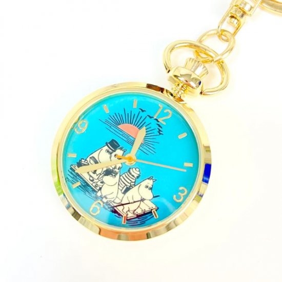 ターコイズカラーが爽やかな文字盤には、ムーミン一家とトゥーティッキーがいかだで旅をしている様子がデザインされています。懐中時計のようなフォルムもオシャレではないでしょうか?高級感もありますよね。