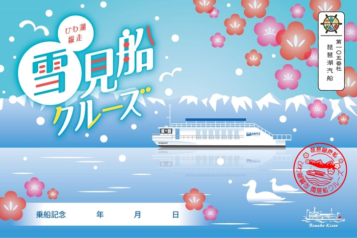美しく雪化粧をした比良山系や、湖面にゆったりと浮かぶ水鳥、湖北の春の風物詩「長浜盆梅展」にちなんだ梅のあしらいなど、「雪見船クルーズ」の魅力をギュッと詰め込んだデザインに仕上げました!