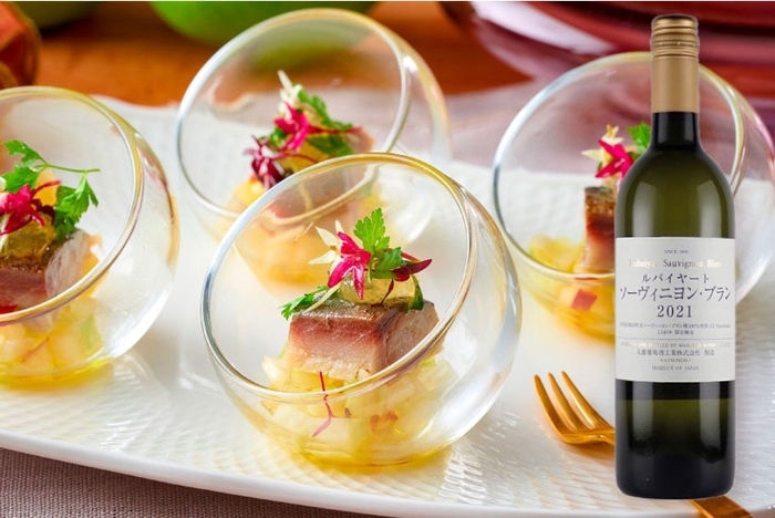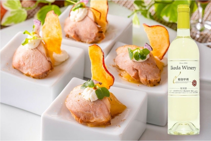 ライブキッチンから焼きたてをご提供する「サーロインステーキ*」や、脂の乗った「寒ぶりのお造り」などももちろんお楽しみいただけますが、山梨ワインとのペアリングを提唱するホテル新光ならではの一手間かかったメニューをペアリングお薦め銘柄と共にご紹介いたします。