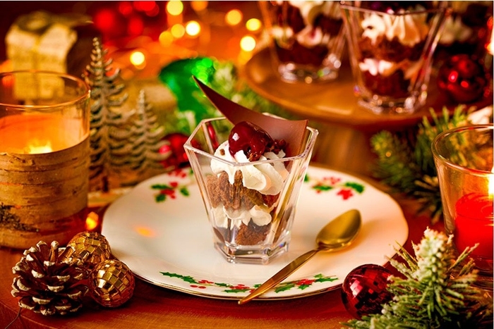 NYショートケーキの他にも、<黒い森>という意味のドイツ南西部の伝統菓子「フォレノワール」をトライフル仕立てにしたデザートもお目見えします。チョコレートベースのスポンジに酸味のあるダークチェリーのコンフィチュールを合わせた一品。コーヒーや紅茶はもちろんですが、ホテル新光ならでは、赤ワインを合わせてお食事の余韻をお楽しみください。